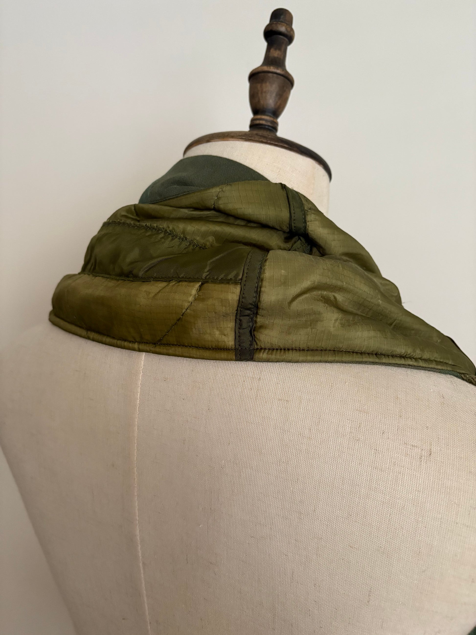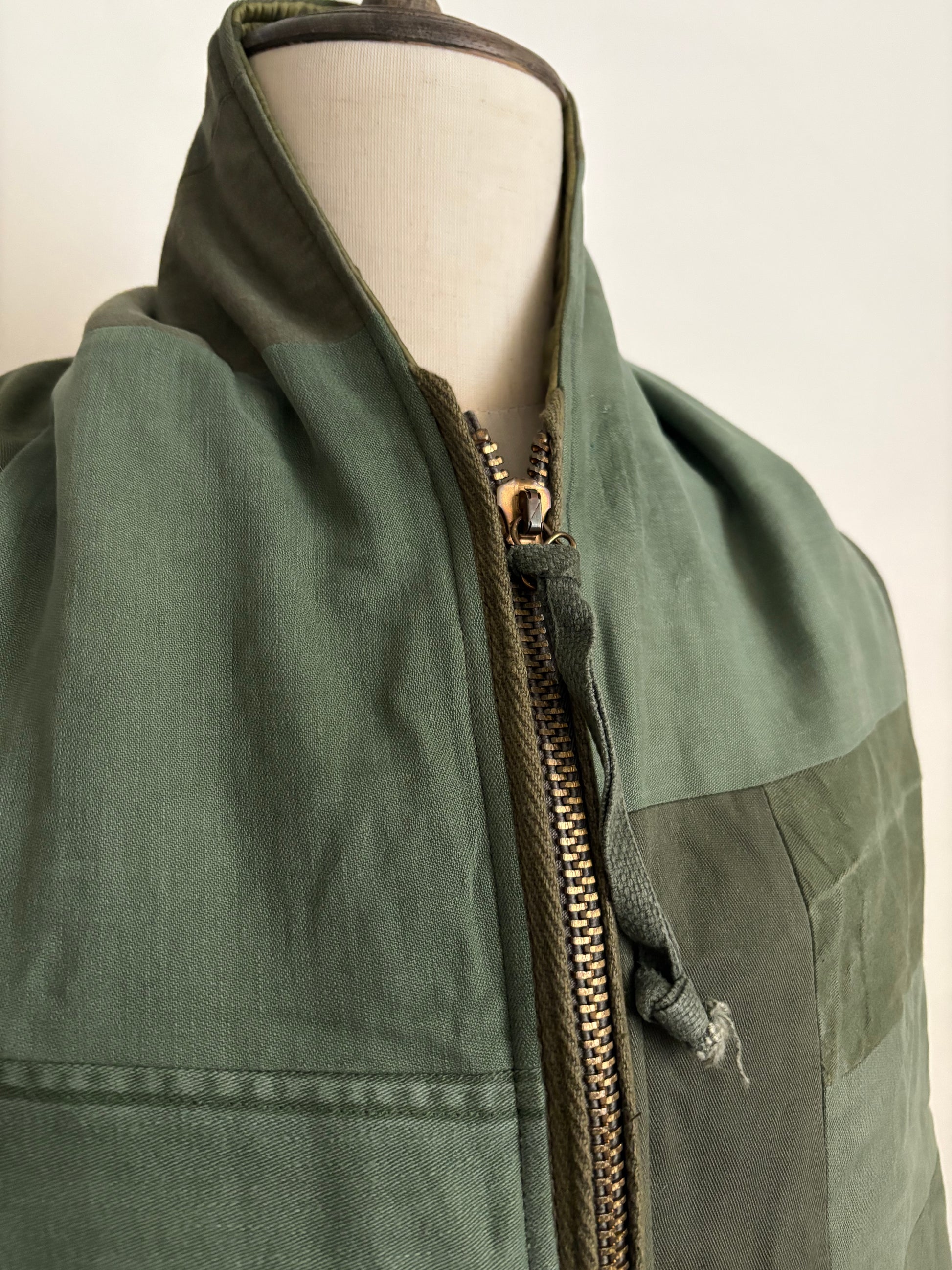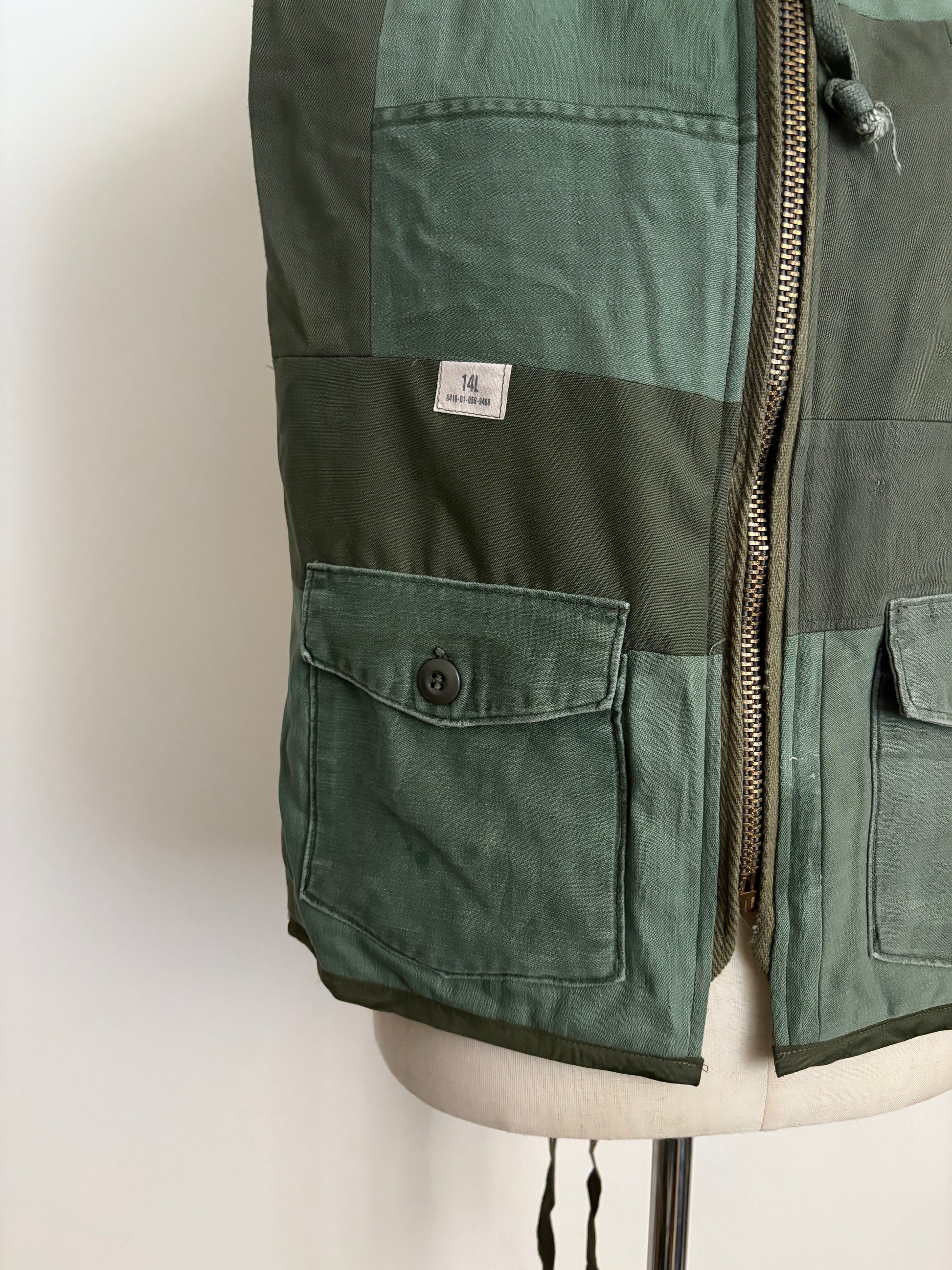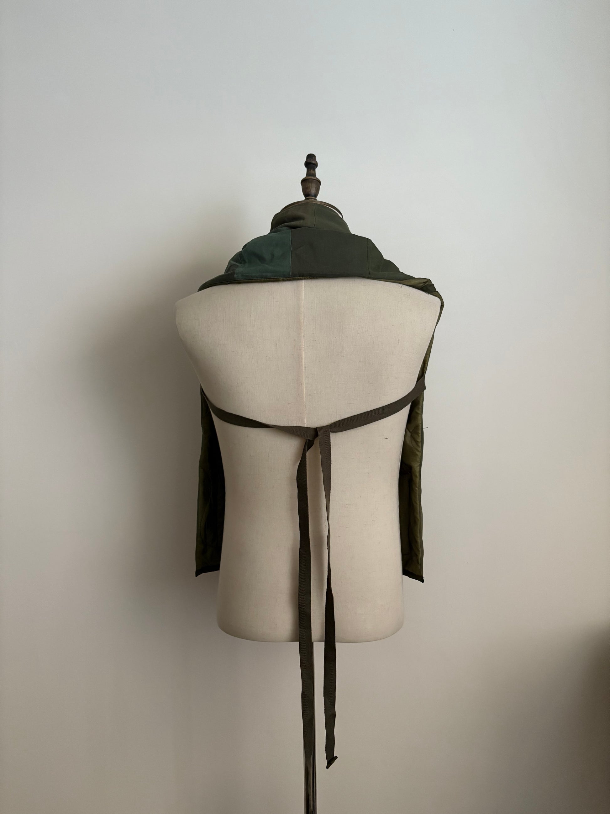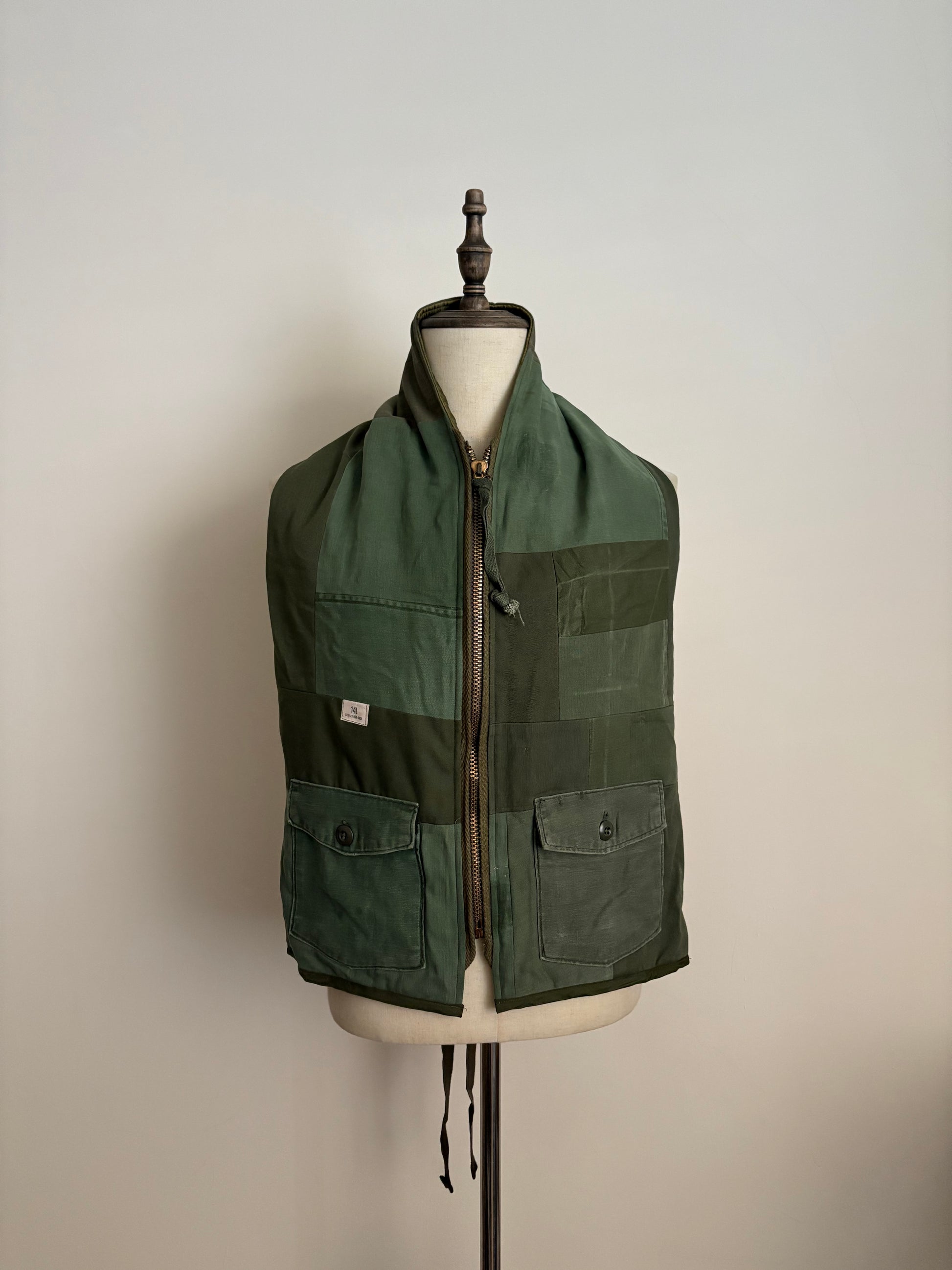This scarf is crafted from deconstructed U.S. military fabrics. It can be secured with zippers and ties, and is fully reversible. Designed with two pockets, it is both versatile and highly functional.