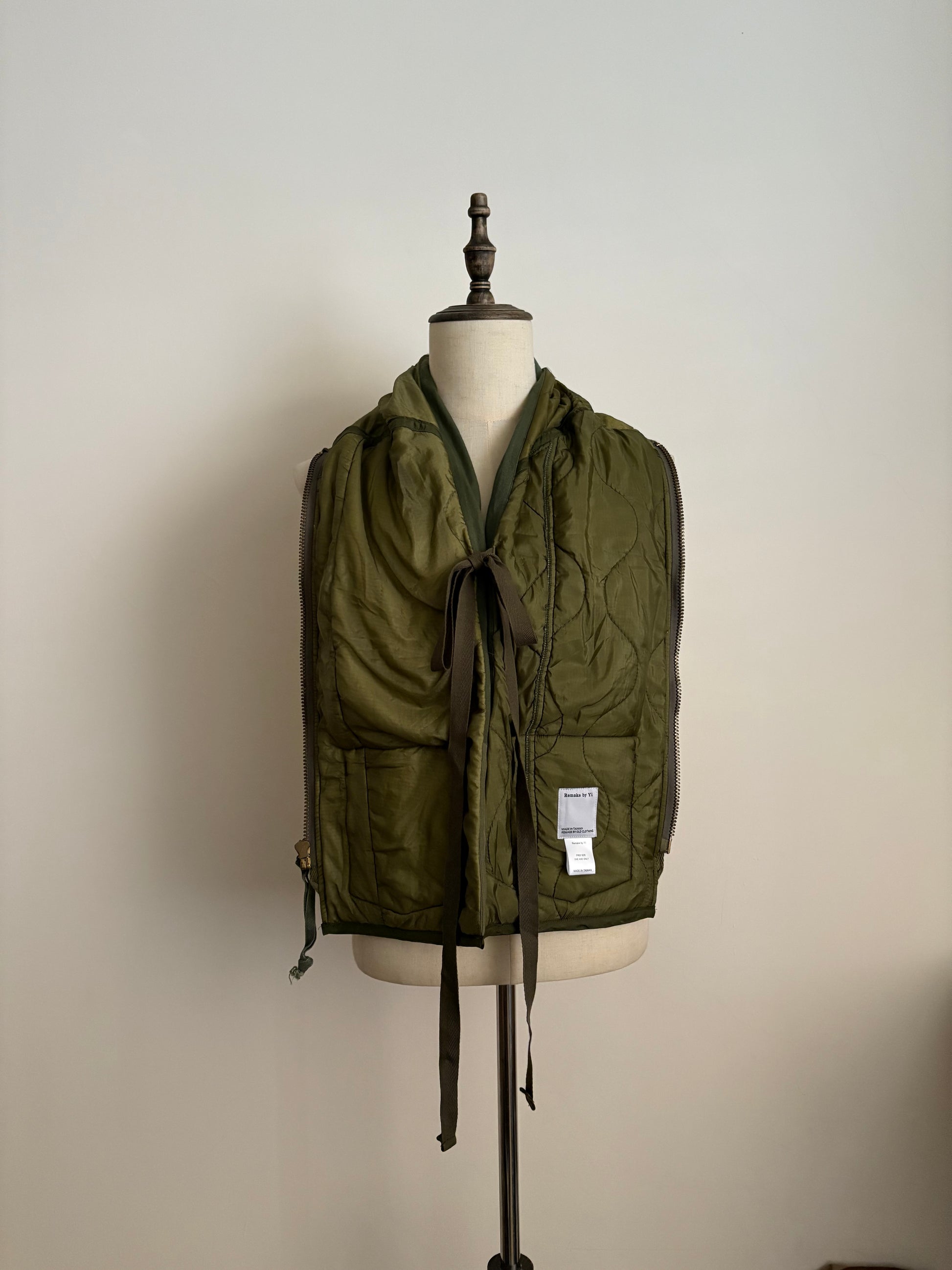 這款圍巾使用美軍拆解後的布料重新製作,可透過拉鏈與綁帶固定,正反兩面皆可使用。設有兩個口袋,兼具好搭配與高度實用性。